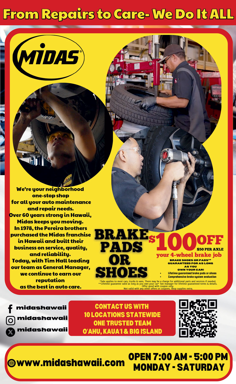 Midas Hawaii Up to $100 Off Your 4-Wheel Brake Job ($50 per axle)