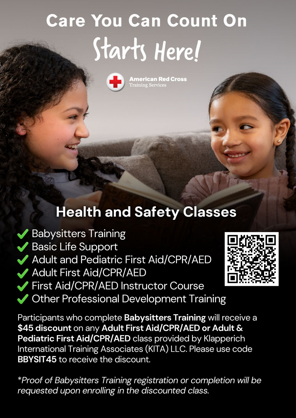 For those who complete Babysitters Training, use code BBYSIT45 for a $45 discount to any Adult First AID/CPR/AED class or Adult and Pediatric First AID/CPR/AED class